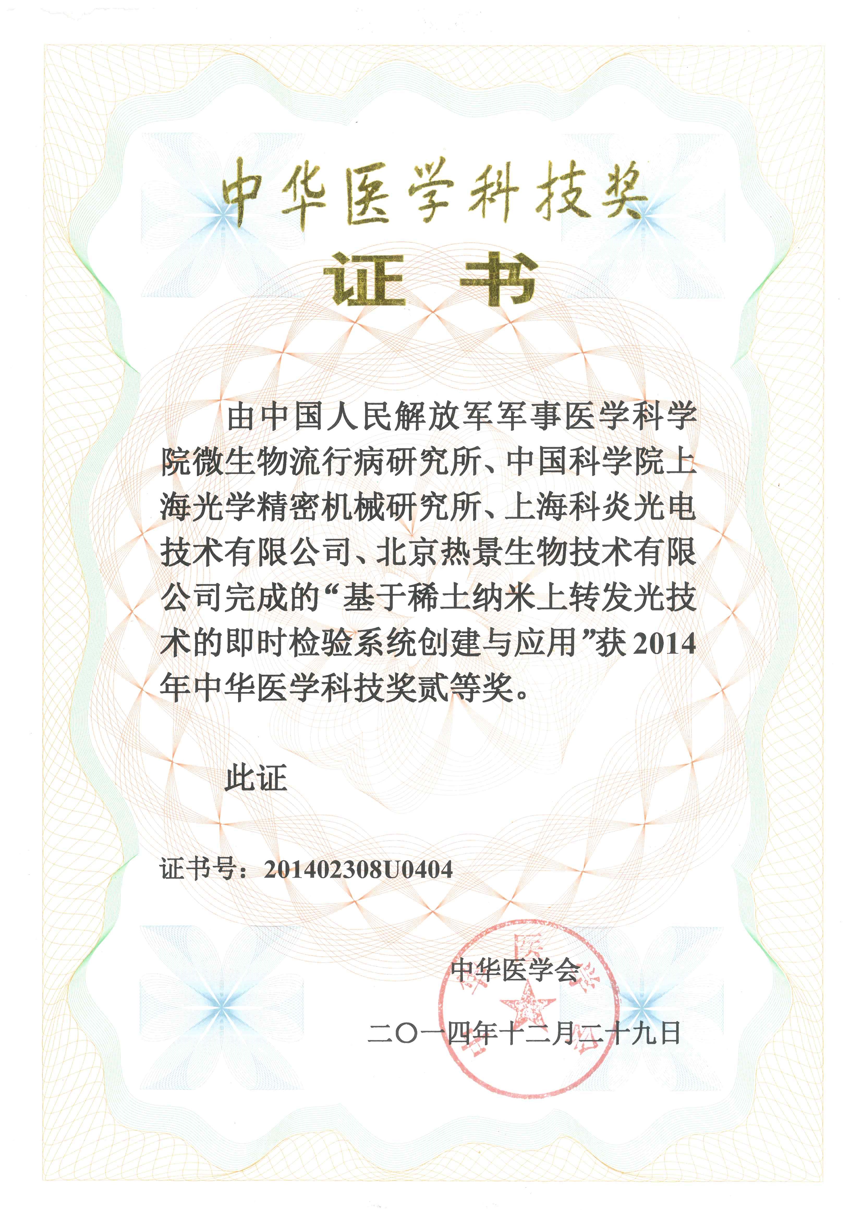 此次熱景生物榮獲中華醫學(xué)科技獎貳等獎,證明熱景生物在“稀土納米上轉發(fā)光技術(shù)應用與創(chuàng )新”方面取得了傲人的成效,并贏(yíng)得了業(yè)內人士及中華醫學(xué)會(huì )的認可,北京熱景生物技術(shù)有限公司的全體員工將繼續奮發(fā),為全人類(lèi)的健康事業(yè)貢獻力量!