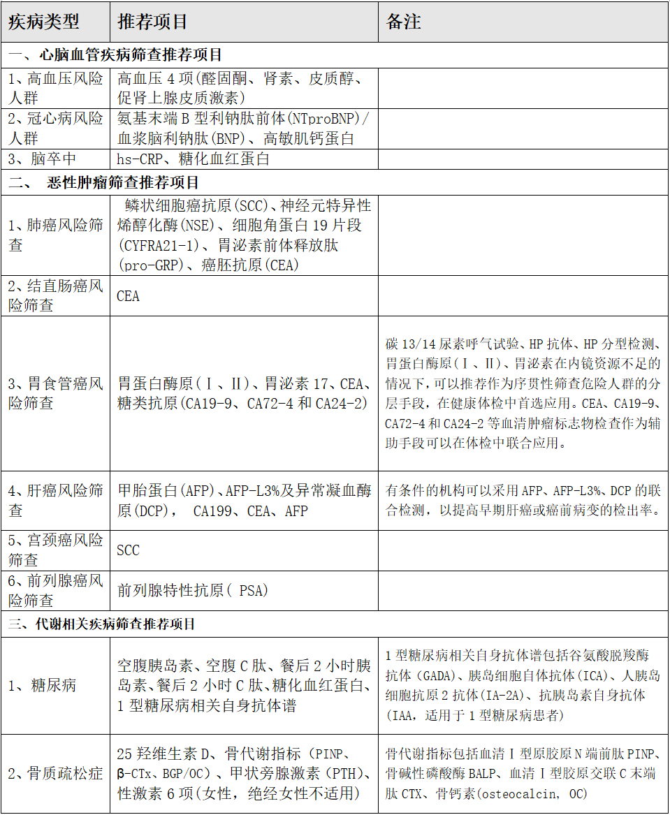 《健康體檢與管理》雜志編委會(huì )聯(lián)合北京醫學(xué)會(huì )健康管理學(xué)分會(huì )等學(xué)術(shù)組織,匯聚了全國健康體檢與管理機構80余位知名專(zhuān)家的意見(jiàn)建議,制定了成人個(gè)體化健康體檢基本項目和常見(jiàn)慢性病篩查體檢項目的推薦清單,形成《成人個(gè)體化健康體檢項目推薦專(zhuān)家共識》,已于近期發(fā)布。針對常見(jiàn)病和慢性病的健康體檢項目推薦清單,熱景生物多個(gè)項目獲得推薦(表1)。