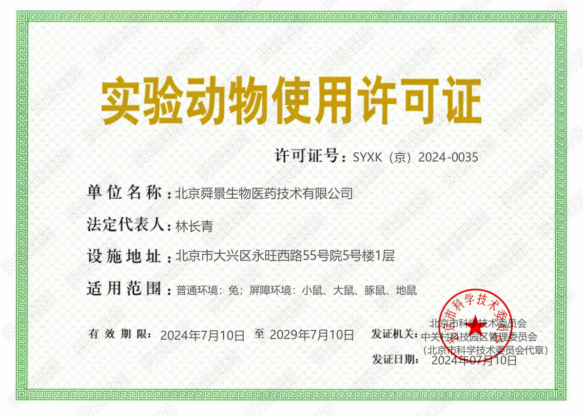 舜景醫藥實(shí)驗動(dòng)物管理中心位于北京市大興區生物醫藥基地慶豐西路55號院5號樓,占地面積約1100平方米,其中屏障環(huán)境約380平方米、普通環(huán)境120平方米,可開(kāi)展SPF級大鼠、小鼠、豚鼠、地鼠及普通實(shí)驗兔的動(dòng)物實(shí)驗研究,設計大、小鼠籠位共2300余籠。該動(dòng)物管理中心已搭建了小動(dòng)物手術(shù)平臺、小動(dòng)物活體成像平臺、CDX、PDX模型平臺等多個(gè)技術(shù)服務(wù)平臺,配備了先進(jìn)的動(dòng)物實(shí)驗儀器設備,包括小動(dòng)物活體成像系統、小動(dòng)物麻醉機、動(dòng)物體視顯微鏡等,可滿(mǎn)足不同學(xué)科高水平的動(dòng)物實(shí)驗需求。