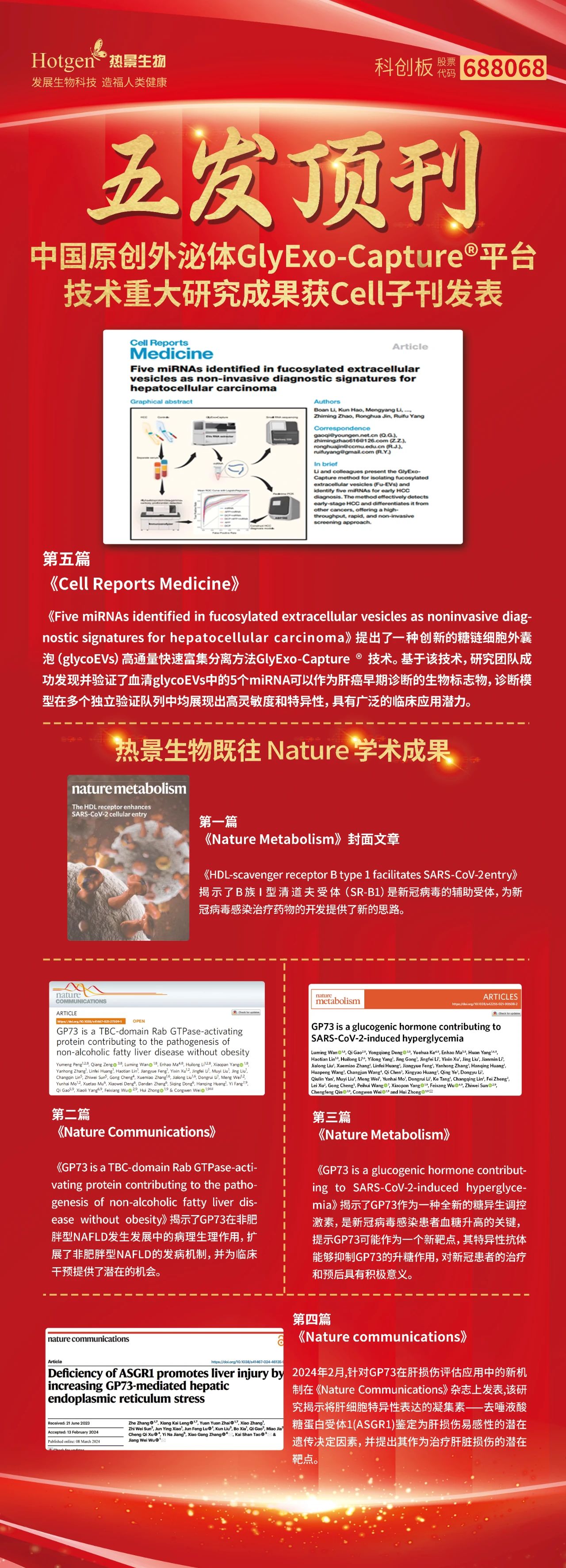 GIyExo-Capture?平臺是中國IVD科研創(chuàng )新創(chuàng )造的一個(gè)典范,針對全球范圍內外泌體液體活檢應用準確率不高,操作繁瑣等臨床應用挑戰,提供了創(chuàng )新的解決方案。該平臺采用糖捕獲技術(shù),實(shí)現疾病相關(guān)外泌體全自動(dòng)、快速高通量分離,以及外泌體運載microRNA的高靈敏度檢測。目前,熱景生物具有自主專(zhuān)利GIyExo-Capture?平臺開(kāi)發(fā)的系列癌癥早期診斷成果陸續通過(guò)注冊檢驗(胰腺癌、肝癌、胃癌等),相關(guān)神經(jīng)退行性疾病研發(fā)項目進(jìn)展順利。作為糖捕獲診斷方法學(xué)的提出者,熱景生物致力于將中國企業(yè)的原創(chuàng )性技術(shù)推廣應用到全球臨床,為全球患者帶來(lái)更精準、更便捷的診斷方案、使更多患者獲益于中國創(chuàng )新技術(shù)。