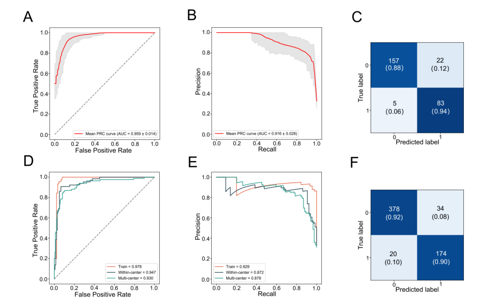 為進(jìn)一步提高模型的診斷性能,我們將miRNA靶標與AFP/DCP特征結合。結果顯示,結合后模型的ROC-AUC值提升至0.96,PRAUC值達到0.91(圖3A-B)。此外,基于該聯(lián)合特征的模型對194例HCC患者的總體靈敏度達到90.70%,顯著(zhù)高于單獨使用miRNA靶標時(shí)的88.06%(圖3C)。這表明miRNA與蛋白特征之間具有互補作用,顯著(zhù)增強了HCC的診斷準確性。